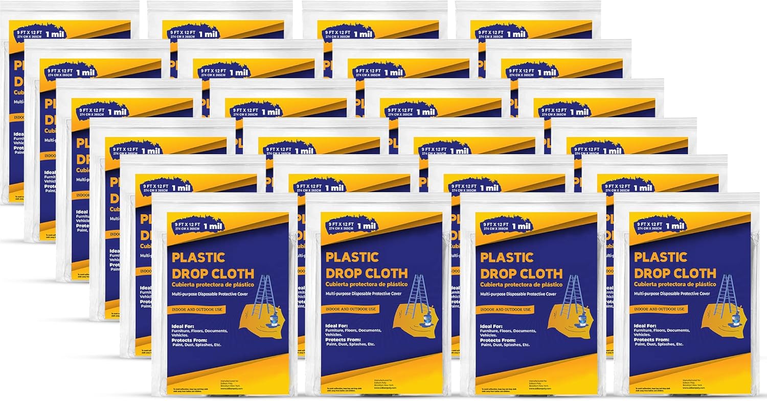 Painters Plastic Drop Cloth - 9 x 12 Feet Paint Tarp 1 Mil Thick Disposable Plastic Sheet for Painting Waterproof Dustproof Clear Plastic Cover for Furniture Floors Cars Remodel your house or complete DIY projects easily with this plastic drop cloth. Made from 100% polyethylene, this cover sheet will offer complete peace of mind as it will cover up your household items and prevent them from getting messy with annoying stains that are a pain to clean up.The sheet is 1 mil thick and measures 9 x 1feet to provide up to 117 square feet of coverage. Heavy-duty sheeting is safe to use, odorless and tear-resistant. It has a s ingle-piece construction meaning you can place it flat on the floor or drape over furniture, electronics, cars, and more to protect them from paint drips, water and dust. Plastic cover sheets are perfect for many types of projects around the house. They allow for hassle-free clean-up as the recyclable plastic can be thrown in the trash when you are done. No more worrying about stains and cleaning after paint jobs with this tarp. Order today!