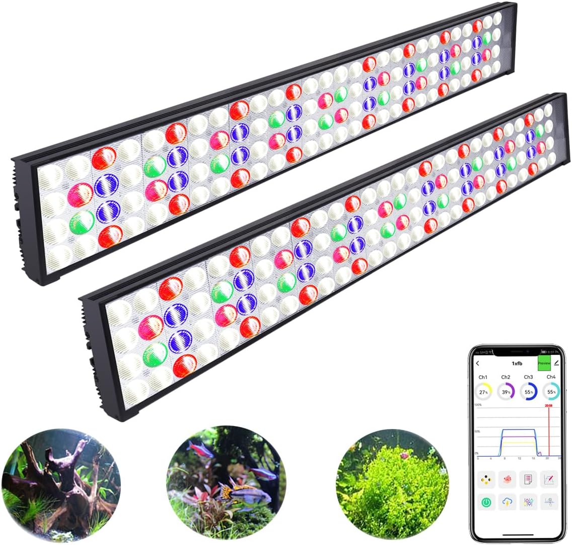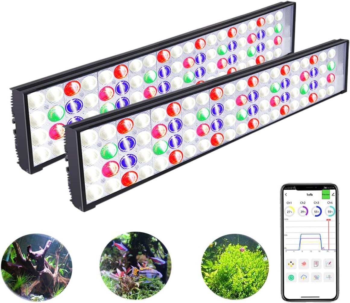 Design: Built-in-Timer with 24 hours day-night cycle, Smart-APP control. Android/IOS support, you can control the light anytime and anywhere. Four channels brightness can be adjusted from 0% to 100% separately, DIY your own setting. Full spectrum that mimic natural light to help freshwater planted achieve the best balance. Upgraded aluminum heat sinks are easy for heat dissipation. Specification: Each Panel Dimension: 54x12x3.6cm (19"x4.7"x1.4") Lighing Area: 60-80cm AC Adaptor: 100-265V worldwide suitable Power consumption: 0.8KWH/day, Max 60 Wattage 30% higher energy efficiency compare with others Channel 1 For Each Panel: 10W plant growth red Channel 2 For Each Panel: 8W moonlight Channel 3 For Each Panel: 33w day white adjust Channel 4 For Each Panel: 12w vivid color Package: 1x 54cm panel 1x hanging kit 1x power supply+plug 1x user manual Cooling Functions: DIY date, time Natural Simulation: sunrise sunset, lunar cycle, moon, 4 seasons Preset Mode: coral fragging, slow acclimation, fast growth, vivid color 4 Channels Programmable and Dimmable
