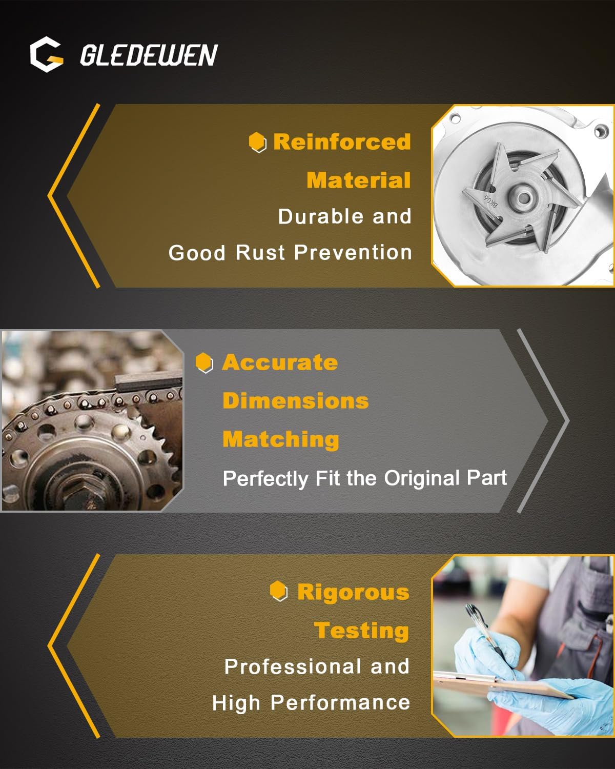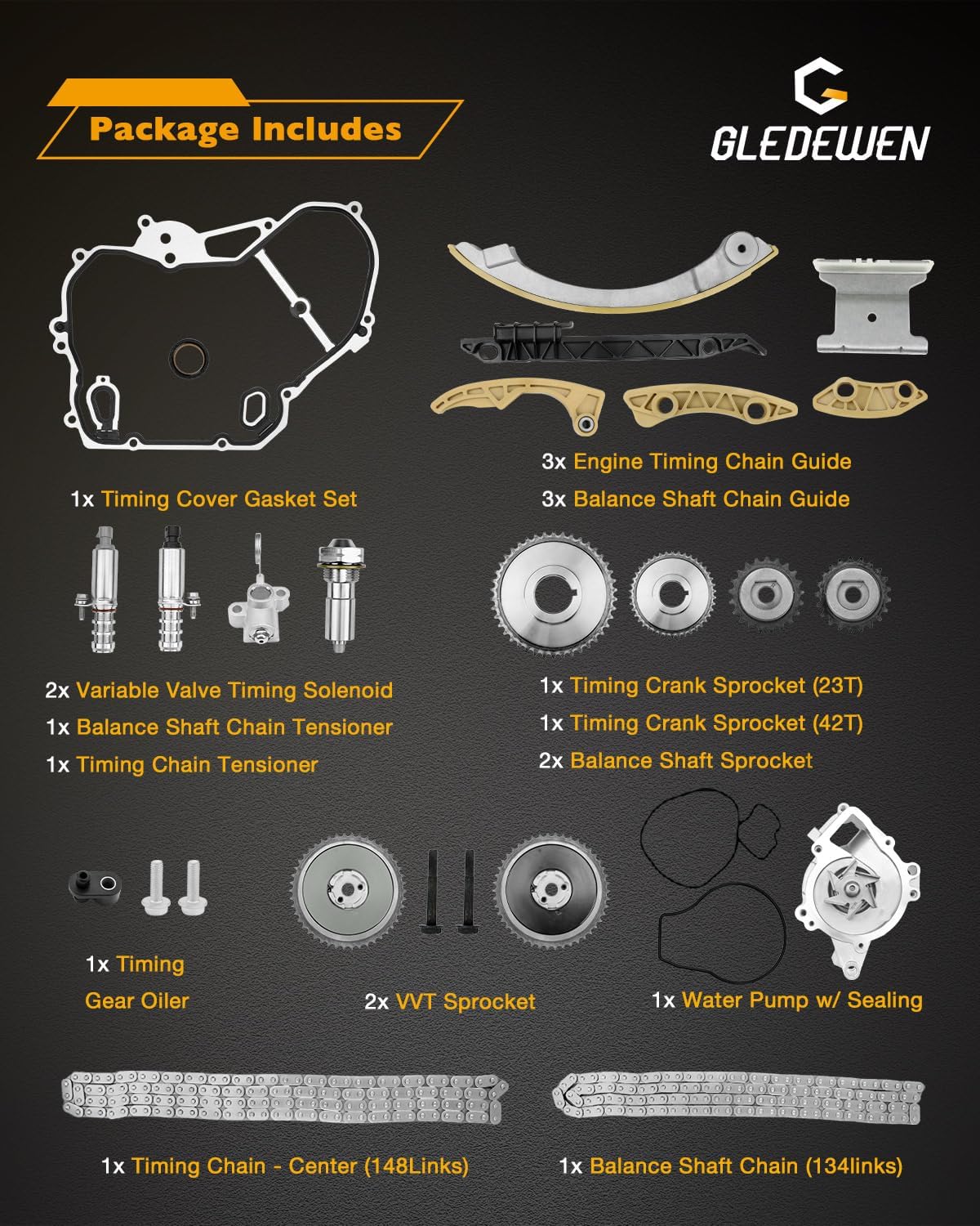 Packing List:1x Timing Chain - Center (148Links)1x Timing Chain Guide- Tensioner Arm (Right)1x Timing Chain Guide- Timing Chain Guide (Left)1x Timing Chain Guide- Timing Chain Guide (Upper)1x Timing Chain Tensioner (Right Upper)1x Timing Crank Sprocket (Outer-23T)2x VVT Sprocket (Right&Left)1x Timing Gear Oiler1x Balance Shaft Chain (134links)1x Balance Shaft Chain Tensioner (Lower)1x Balance Shaft Chain Guide (Left)1x Balance Shaft Chain Guide (Right)1x Balance Shaft Chain Guide (Upper)1x Balance Shaft Sprocket (Right-21T)1x Balance Shaft Sprocket (Left-21T)1x Timing Crank Sprocket (Inner-42T)2x Variable Valve Timing Solenoid1x Water Pump w/ Sealing1x Timing Cover Gasket SetCondition: NewCompatible with:Fit for Chevrolet (16 Valve):2013-2015 for Chevrolet Captiva Sport 2.4L 2384cc 145cid L4 DOHC2012-2015 for Chevrolet Captiva Sport 2.4L 2384cc 145cid L4 Flex DOHC2012 for Chevrolet Captiva Sport 2.4L 2405cc 147cid L4 DOHC2009-2010 for Chevrolet Cobalt 2.2L 2198cc 134cid L4 DOHC2011-2017 for Chevrolet Equinox 2.4L 2384cc 145cid L4 DOHC2012-2017 for Chevrolet Equinox 2.4L 2384cc 145cid L4 Flex DOHC2009-2011 for Chevrolet HHR 2.2L 2198cc 134cid L4 Flex DOHC2014 for Chevrolet Impala 2.4L 2384cc 145cid L4 Electric/Gas DOHC2013-2014 for Chevrolet Malibu 2.4L 2384cc 145cid L4 Electric/Gas DOHCFit for GMC & Pontiac (16 Valve):2011-2017 for GMC Terrain 2.4L 2384cc 145cid L4 DOHC2012-2017 for GMC Terrain 2.4L 2384cc 145cid L4 Flex DOHC2009 for Pontiac G5 2.2L 2198cc 134cid L4 DOHCFit for Buick (16 Valve):2011 for Buick Lacrosse 2.4L 2384cc 145cid L4 DOHC2012-2016 for Buick Lacrosse 2.4L 2384cc 145cid L4 Electric/Gas DOHC2011 for Buick Regal 2.4L 2384cc 145cid L4 DOHC2012-2016 for Buick Regal 2.4L 2384cc 145cid L4 Electric/Gas DOHC2012-2017 for Buick Regal 2.4L 2384cc 145cid L4 Flex DOHC2012-2017 for Buick Verano 2.4L 2384cc 145cid L4 Flex DOHCPrecise Fit Part Numbers:94201S, 9-4201S, 9-4201SX, 94201SX, 9-4202S, 94202S, C6209S, 12680750, 12635048, 24461834, 90537388, 24449448, 95375, 13104978, 12588387, 90537337, 12608580, 24424758, 12577163, 12635427, 12645237, 90537370, 90537300, 90537369, 90537299, 90537336, 90537295, 90537435, 90537301, 12578515, 917-270, 12578516, 12621505, 917-254, VC107, 12655420, 12628347, 12646783, 12578517, 12679099, 12655421, 12628348, 12646784, 12578518, 12679100, 917216, 1258226, 12591894, TCC134-A, TCS46079.